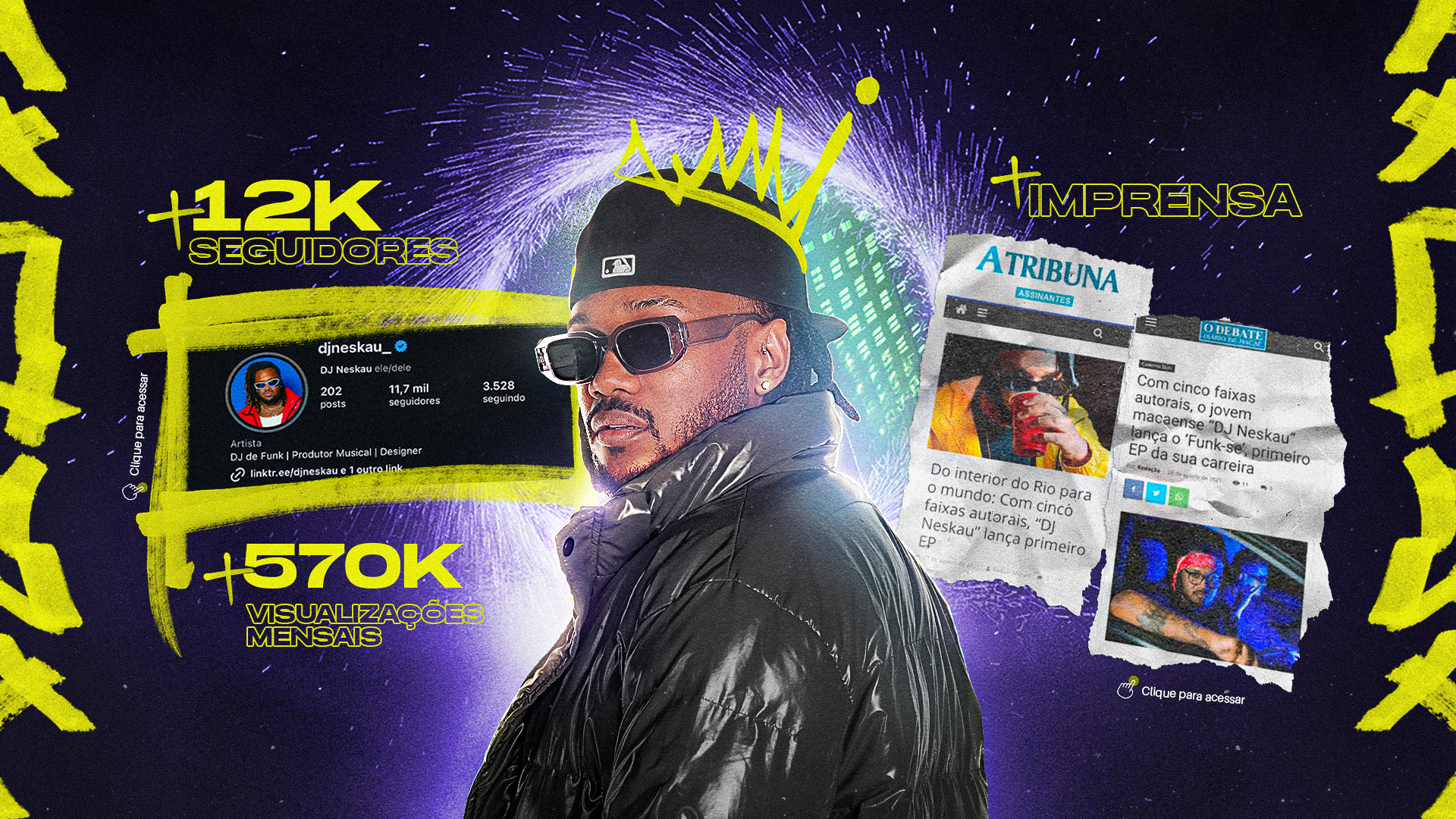 Nascido em Macaé, cidade litorânea do Rio de Janeiro conhecida por suas belezas naturais, o DJ Neskau é um dos DJs de funk mais respeitados da região. Com um estilo cheio de energia que mistura funk, rap, trap e hip-hop, ele traz uma vibe única a cada evento. Seu talento e dedicação lhe renderam reconhecimento em toda a Baixada Litorânea e no Norte Fluminense, onde é presença assídua nas maiores festas. Como amigo próximo, tive a honra de criar estas composições para suas agendas mensais ao longo dos anos, capturando a essência de seu estilo de vida e o impacto das festas noturnas de rua.