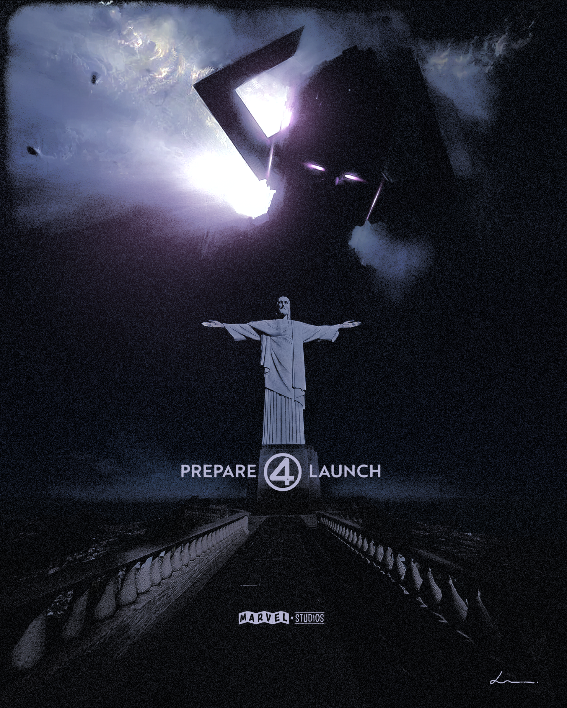 O filme Quarteto Fantástico: Primeiros Passos (2025) marca a introdução oficial da equipe mais icônica da Marvel ao Universo Cinematográfico, explorando sua origem e os primeiros desafios que moldam a família de heróis. A trama promete redefinir o grupo para uma nova geração, misturando ciência, aventura e drama humano. Inspirado nesse novo começo, o pôster variante apresenta Galactus em uma cena grandiosa, observando o Cristo Redentor no Rio de Janeiro. A escolha do monumento traduz uma visão internacional, como se o Devorador de Mundos contemplasse não apenas um país, mas toda a humanidade. A composição reforça a escala cósmica do personagem e sua ameaça global, ao mesmo tempo em que dialoga com a ideia de que nenhum lugar está fora de seu alcance. Um design que conecta o épico da narrativa ao simbólico do mundo real, trazendo uma perspectiva única para este capítulo inaugural da equipe.